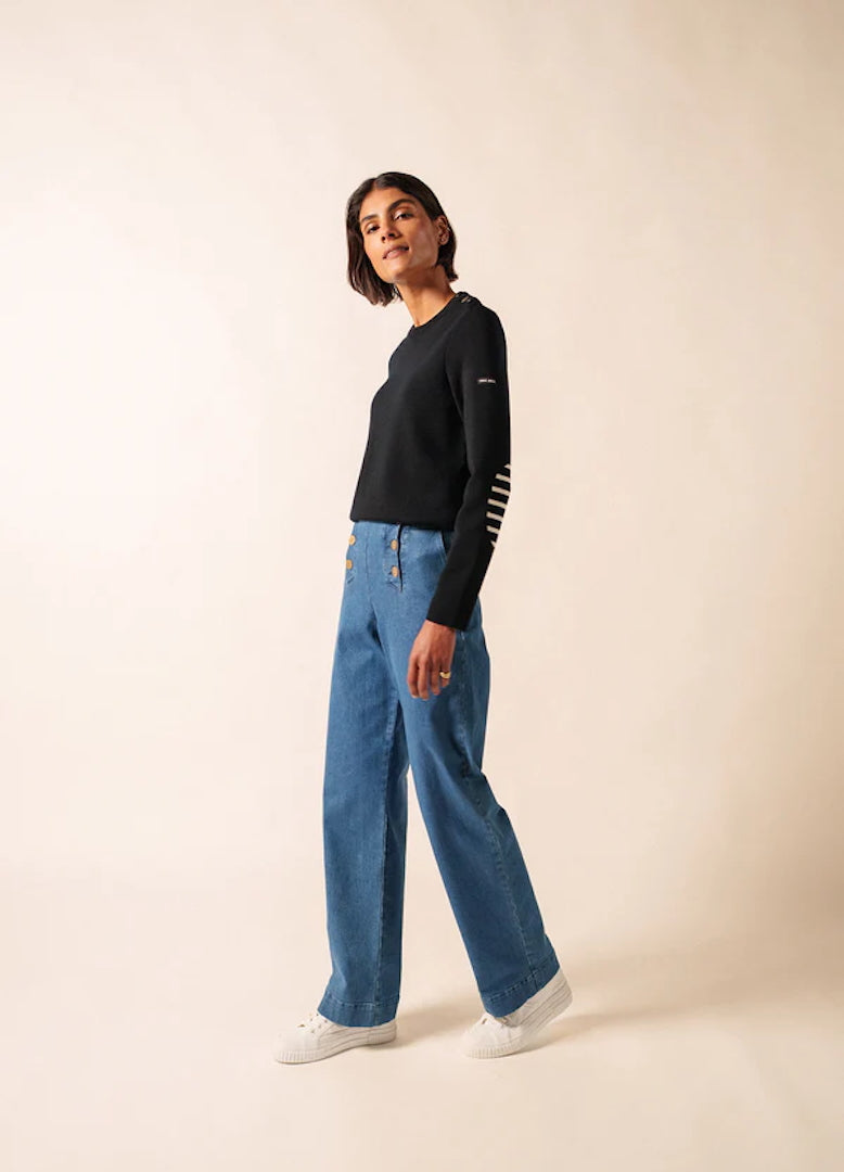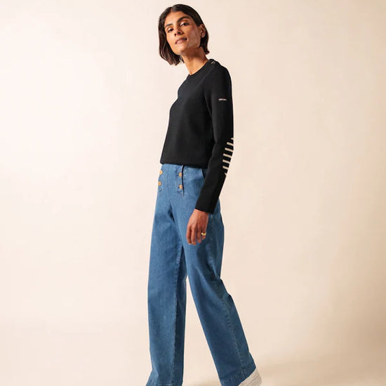 Its straight, comfort fit makes it more relaxed than our Marée jumper, perfect for those who appreciate ease without compromising the iconic Breton look. Thoughtful details, such as elbow patches and a sailor shirt–inspired button, bring a touch of originality while paying homage to classic nautical style.