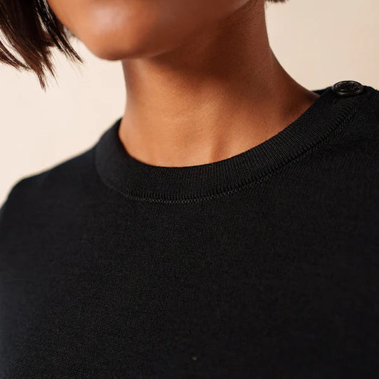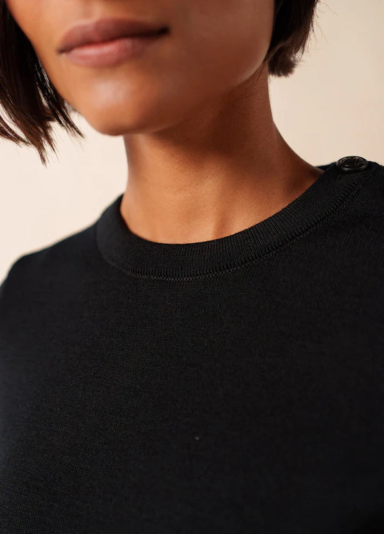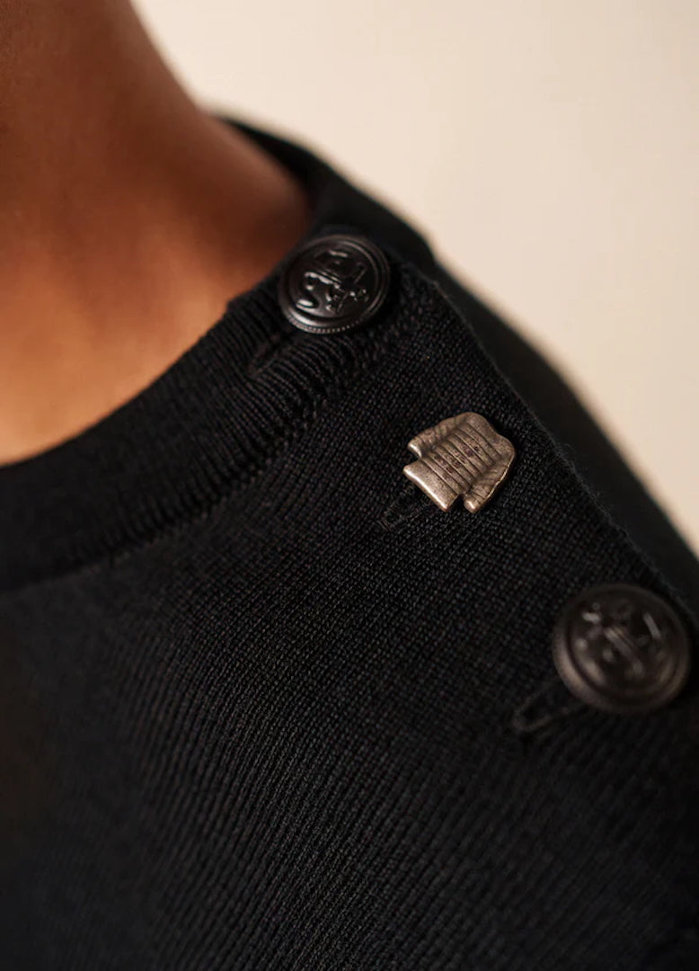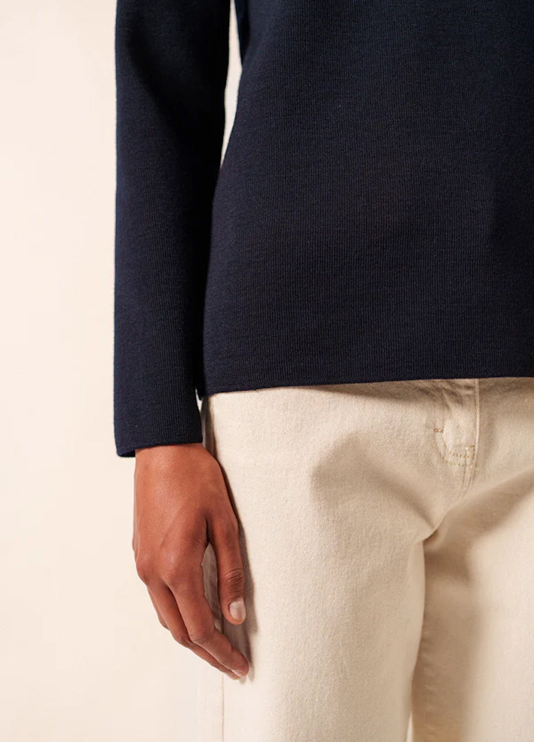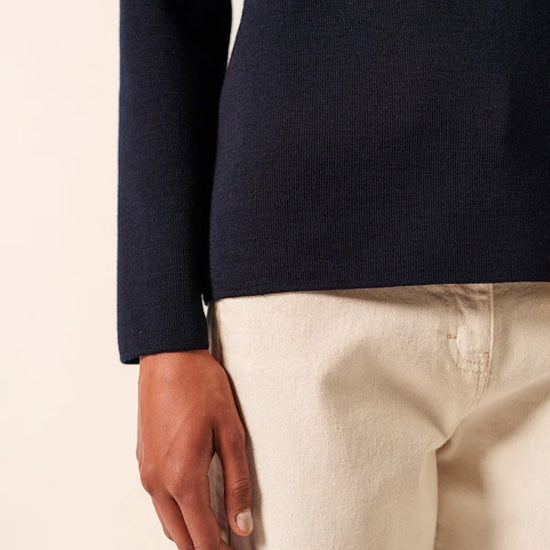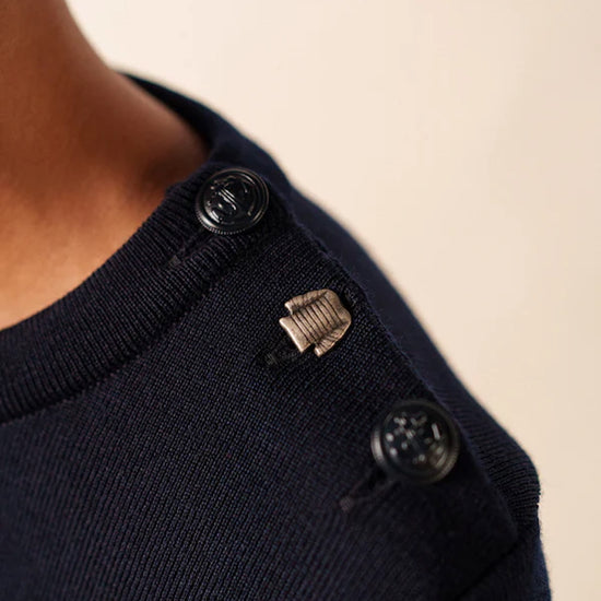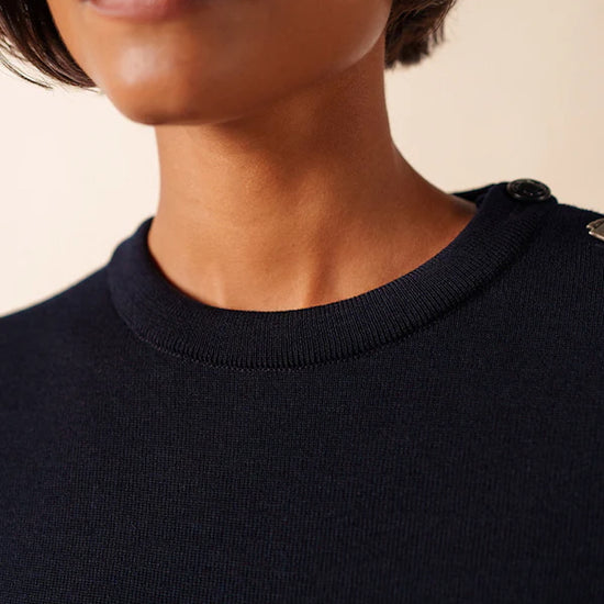 Designed with a straight, comfort fit, the Brégançon offers more ease than our Marée jumper while preserving the clean, authentic lines of traditional Breton knitwear. The refined navy shade enhances its classic character, while carefully crafted details—such as reinforced elbow patches and a sailor shirt–inspired button— introduce a discreet touch of originality rooted in maritime tradition.