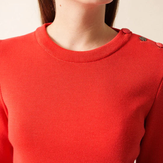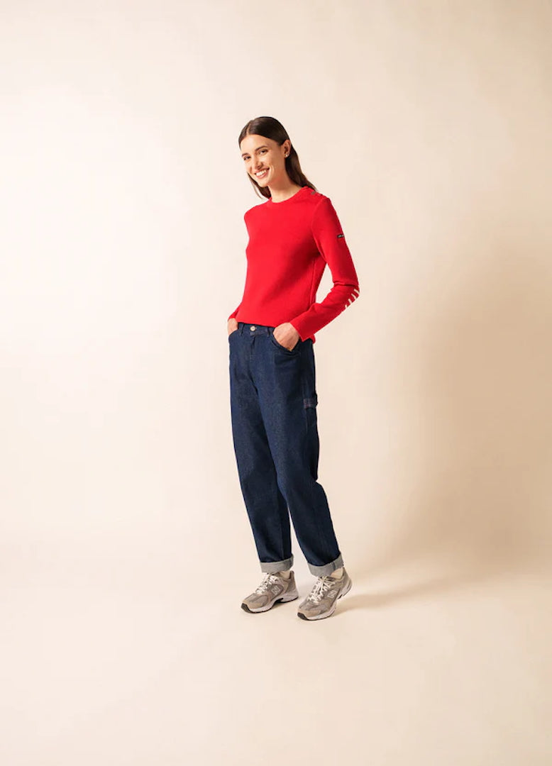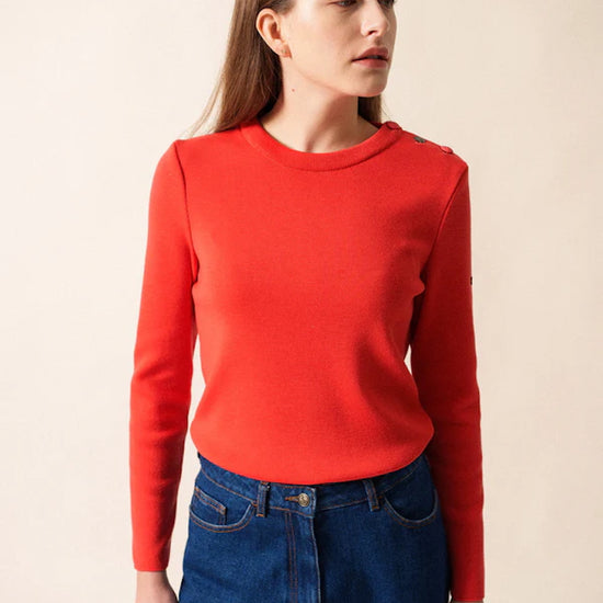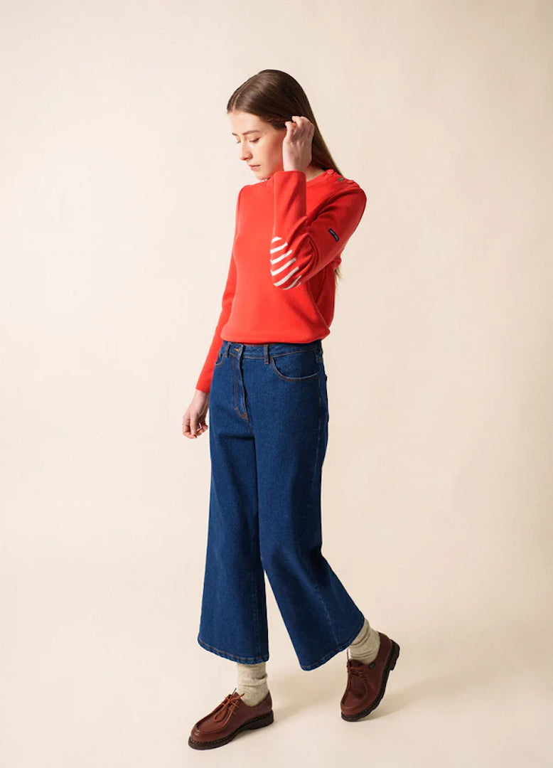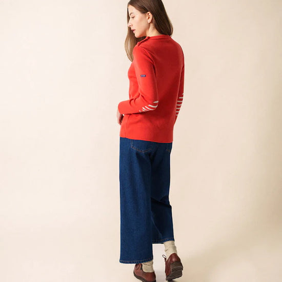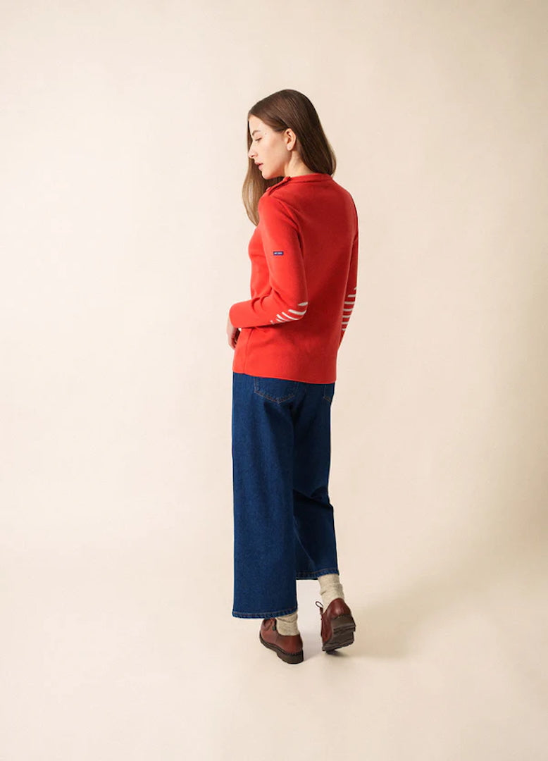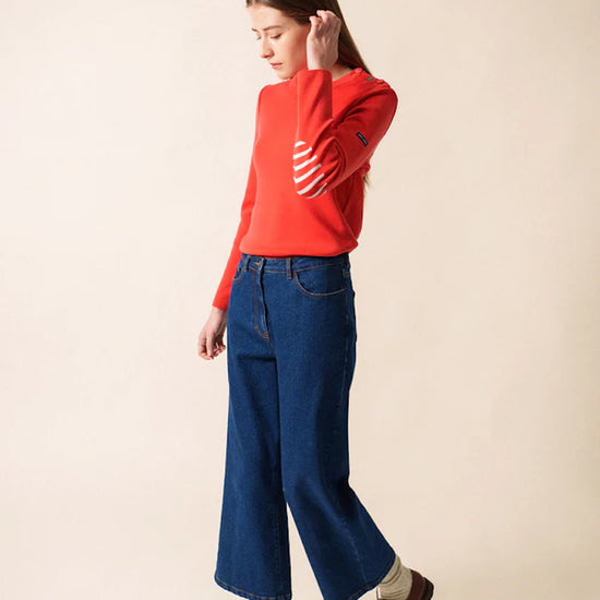 Its straight, comfort fit makes it more relaxed than our Marée jumper, giving you ease of movement while preserving the clean, structured look of authentic Breton knitwear. The distinctive Rodeo shade adds character and modernity, bringing a richer, warmer tone to this iconic silhouette. Signature details—reinforced elbow patches and a sailor shirt–inspired button—introduce subtle originality, echoing maritime tradition with a contemporary edge.