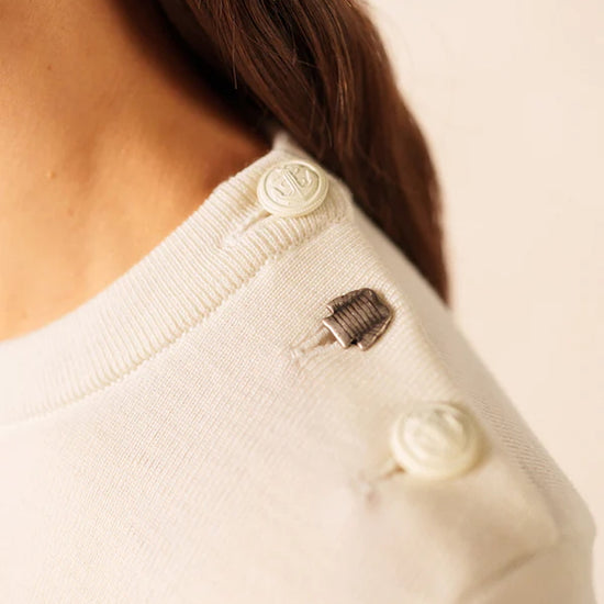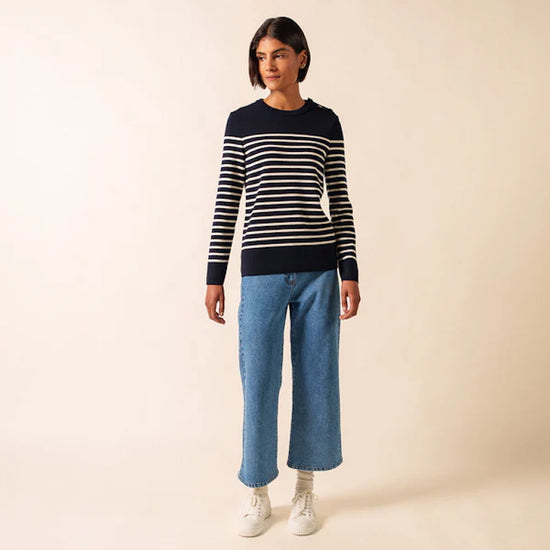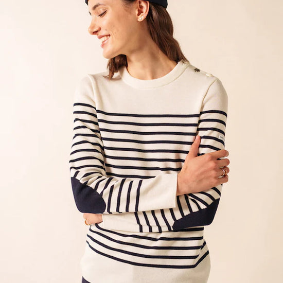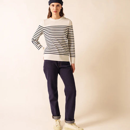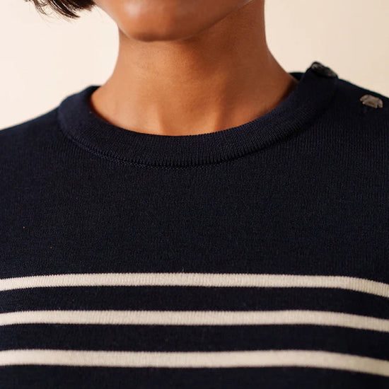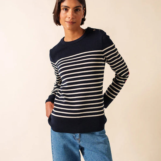 Ideal for seaside escapes as well as city chic outfits, the White / Navy / Navy Brégançon jumper is a wardrobe essential for women who appreciate quality, elegance, and the unmistakable spirit of French craftsmanship.