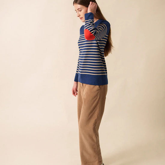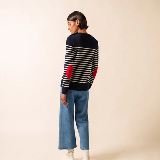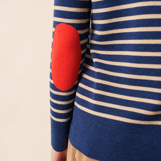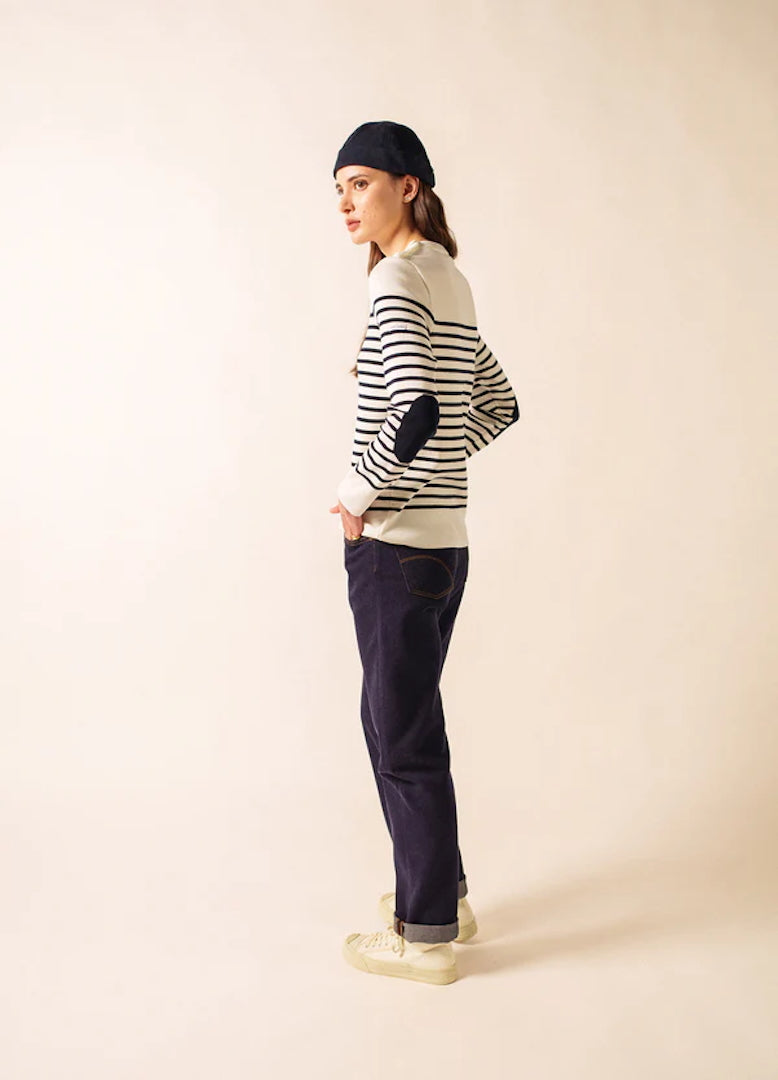 Crafted with the exceptional expertise Saint James is known for, this women’s jumper elevates the traditional marinière with its signature contrasting navy elbow patches—a stylish and practical detail that enhances durability while adding a touch of contemporary flair.