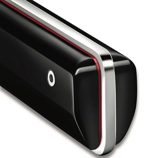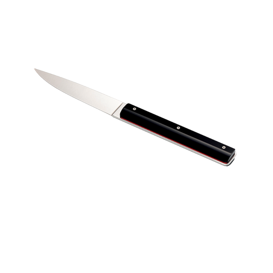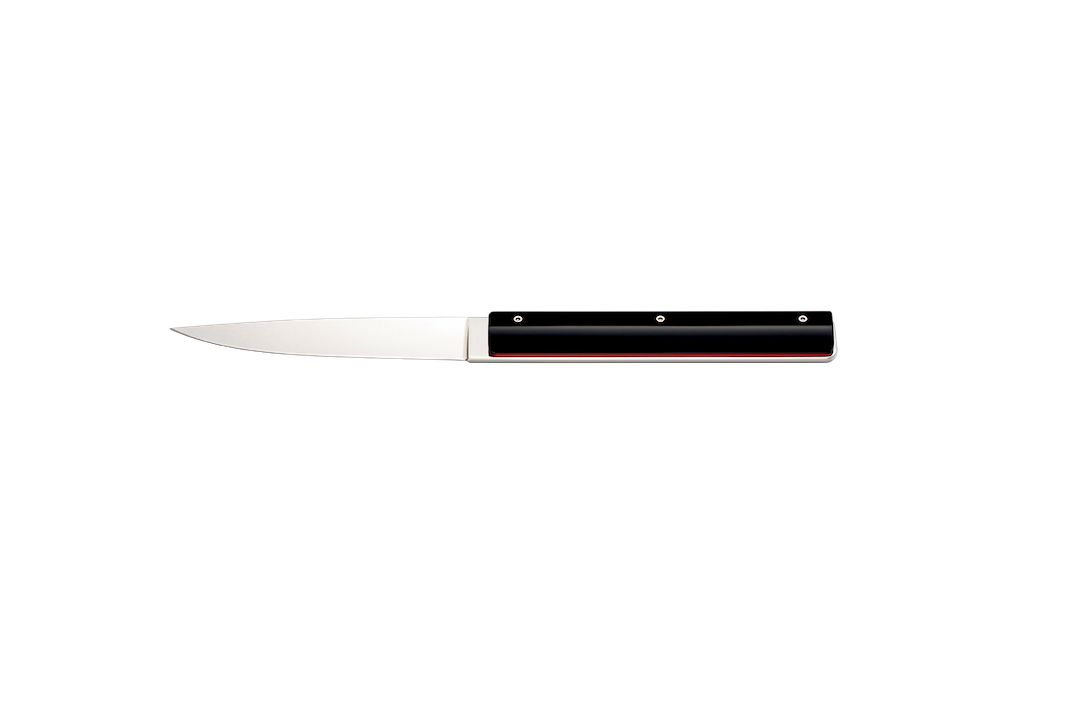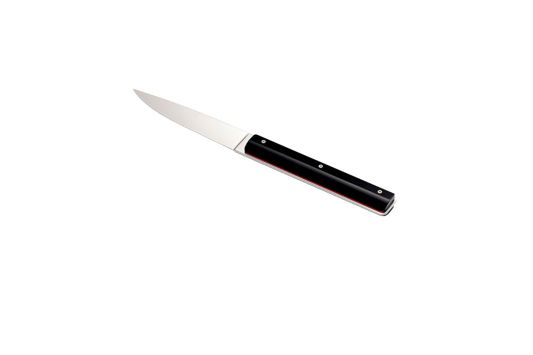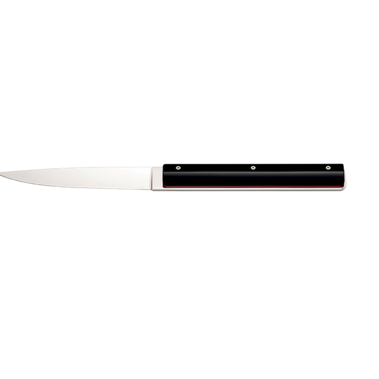 Available in black or white, these knives feature a sleek, high-gloss finish, reminiscent of a lacquered piano’s perfection. Their acrylic handles offer a luminous shine, a material choice that reflects a commitment to unparalleled aesthetics and craftsmanship - though requiring handwashing to preserve its brilliance. A subtle red border at the neck serves as the collection’s signature detail, adding a refined asymmetry.