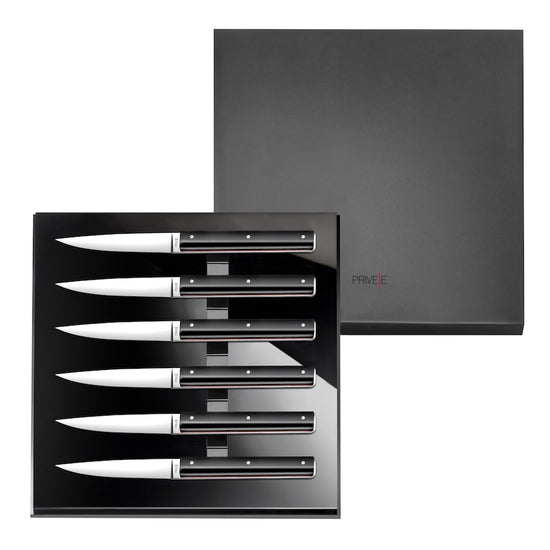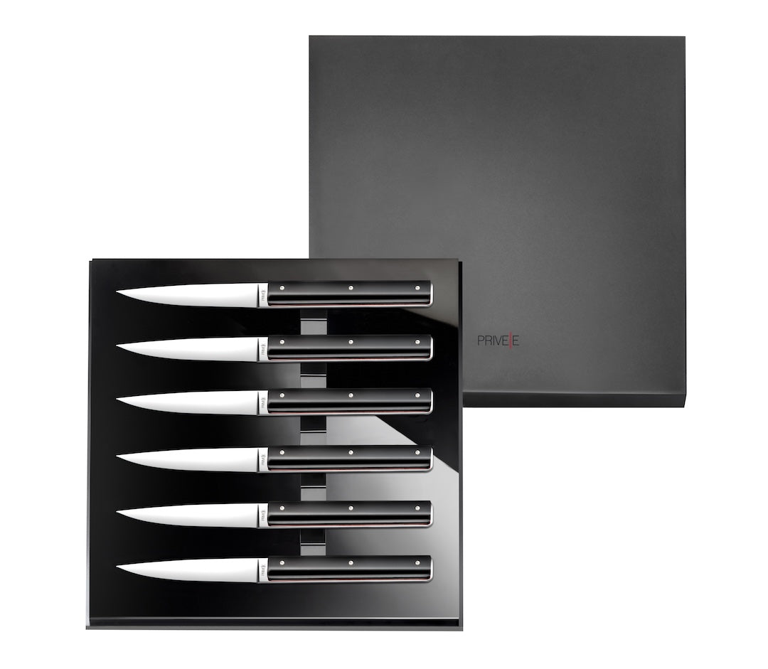 The Privée AM|PM table knives embody the perfect balance of refined design and cutting-edge technology. Inspired by the iconic Privée pocket knife, this exquisite set brings a touch of sophistication to every dining experience.