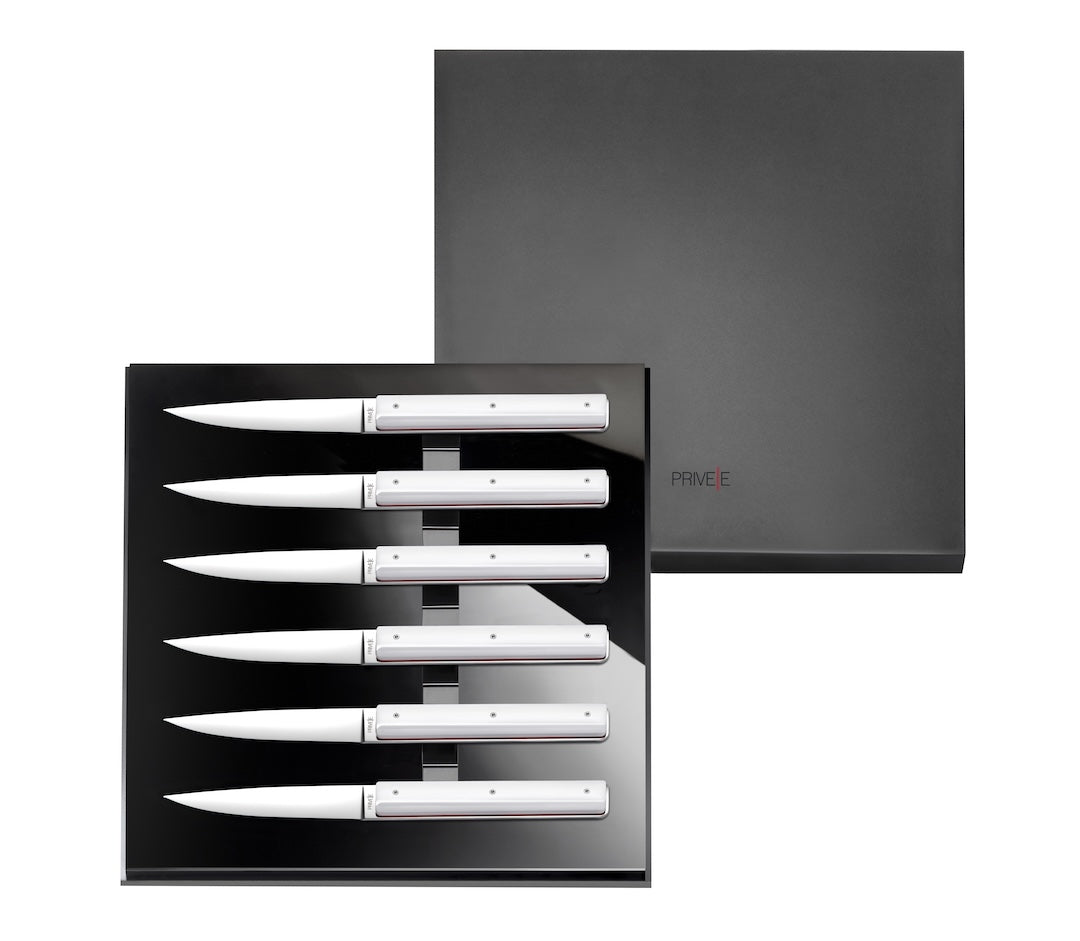 Available in black or white, the Privée AM|PM knives boast a flawless, high-gloss finish, reminiscent of a lacquered piano. Their acrylic handles radiate an unmatched brilliance, a deliberate choice to enhance both aesthetics and luxury. Though not dishwasher-safe, this material underscores the commitment to exquisite craftsmanship. A discreet red border at the neck serves as the collection’s signature, adding an elegant asymmetry that sets these knives apart.
