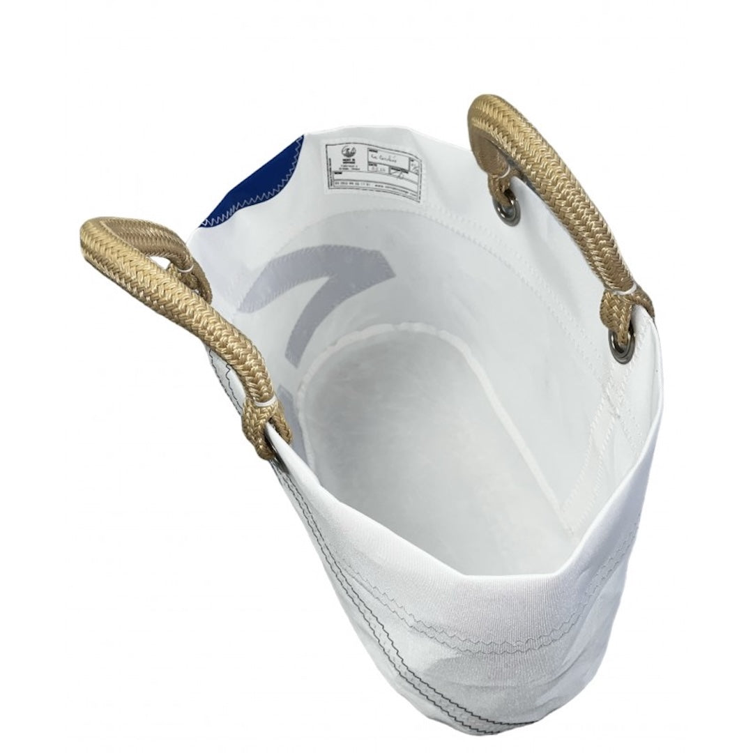 Made from white Dacron sailcloth, this bag is sturdy, easy to clean, and built to last. The dark blue braided handles are hand-tied for a comfortable grip, making it a joy to carry anywhere.