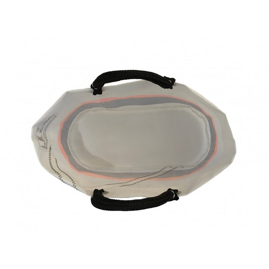 Crafted from upcycled white Dacron, this fabric is strong, easy to maintain, and built to last. The dark blue hand-tied braided handles ensure a comfortable carrying experience wherever you go.