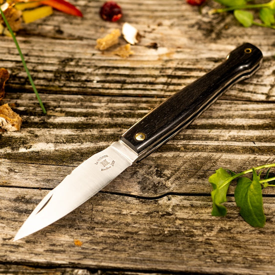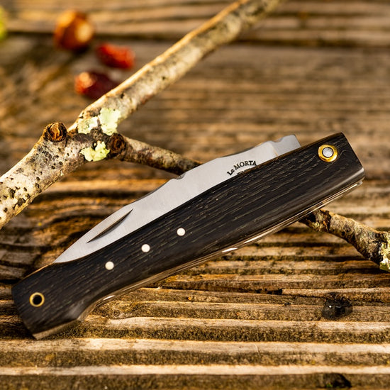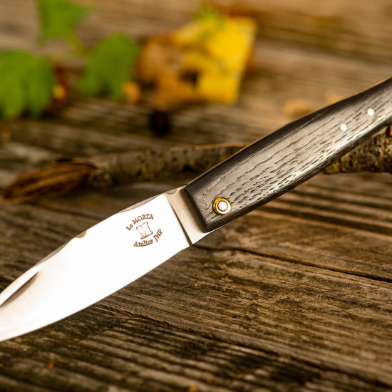 Available with a full Morta handle or enhanced with three mammoth ivory inlays – combining two rare fossils: 10,000 years for the ivory and 5,000 years for the Morta. The Sandvik 14c28n steel blade ensures excellent sharpness, with a hardness of 59 HRC Rockwell, offering both corrosion resistance and easy sharpening.