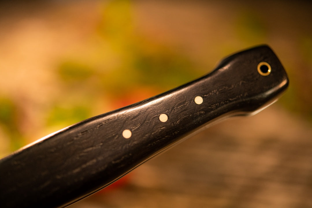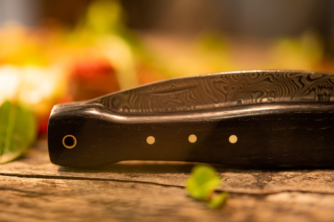 The blade is crafted from N690 and DE 45ncd16 Damascus steel, folded over 120 layers to achieve a hardness of 61 HRC. Sharpening is simple, whether using a honing rod or a natural sharpening stone.
