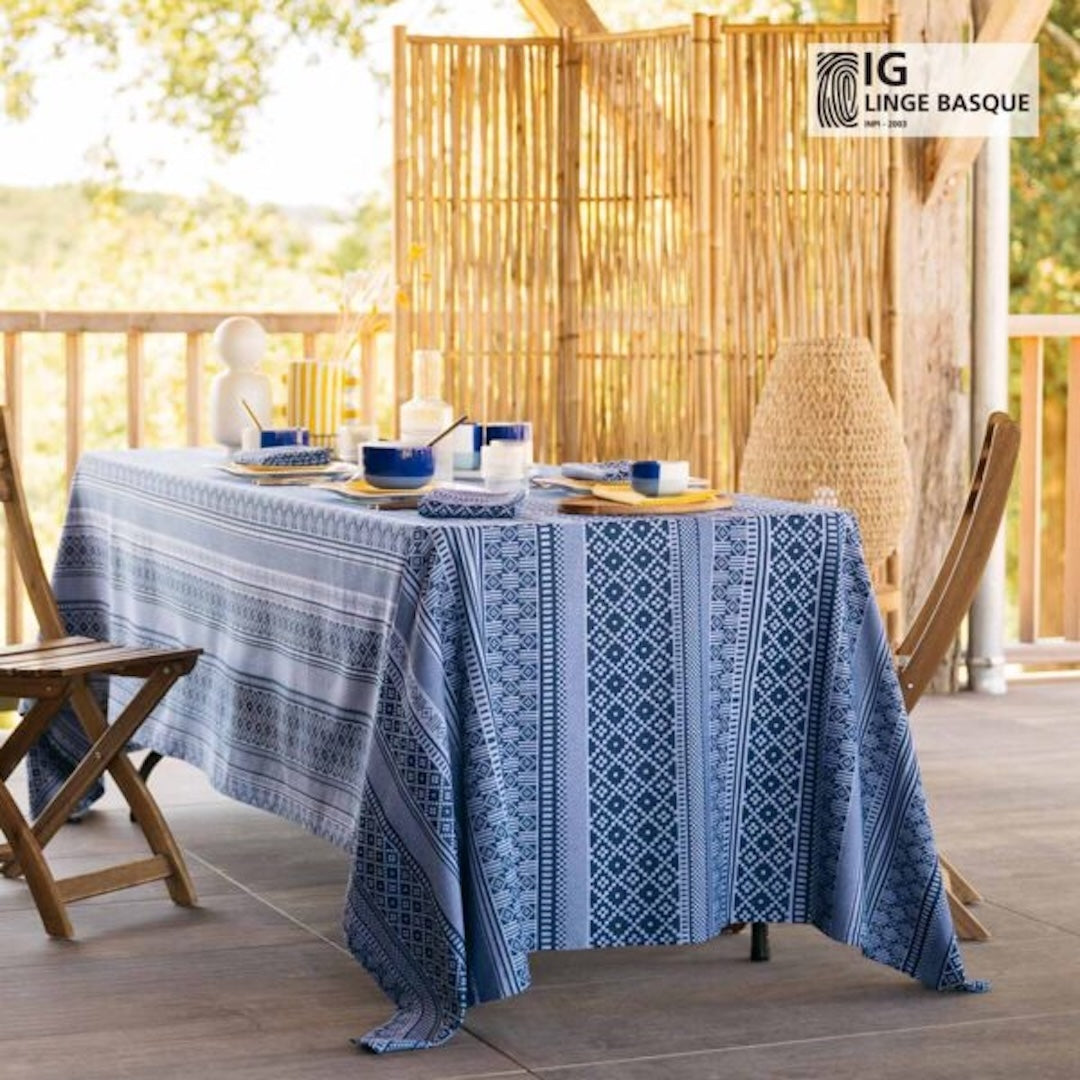 Whether used for family meals, festive gatherings, or as a decorative centerpiece, this Blue Graphic Tablecloth adds a sophisticated and artistic touch to your dining experience, embodying the timeless excellence of Moutet Tissage.
