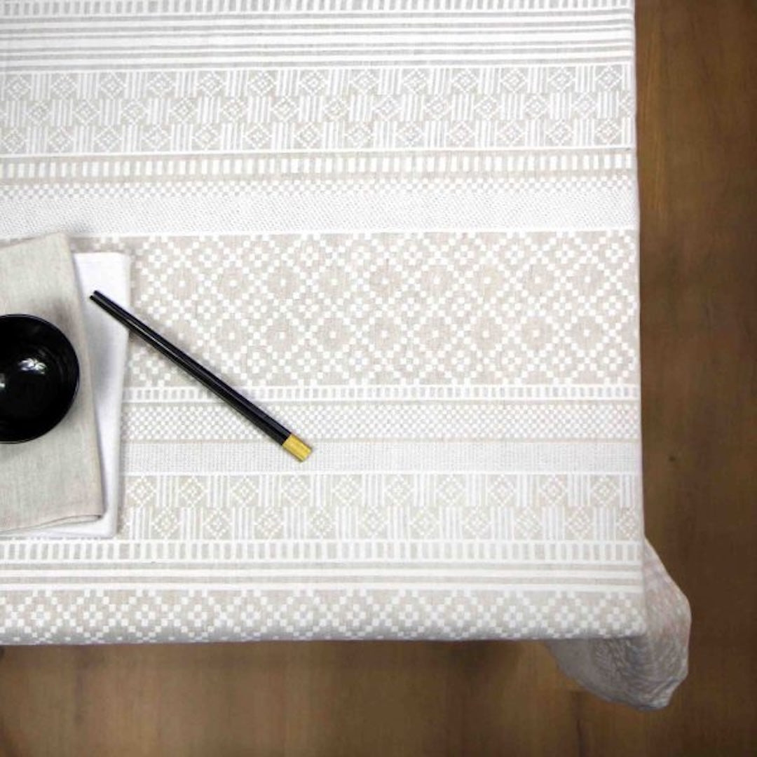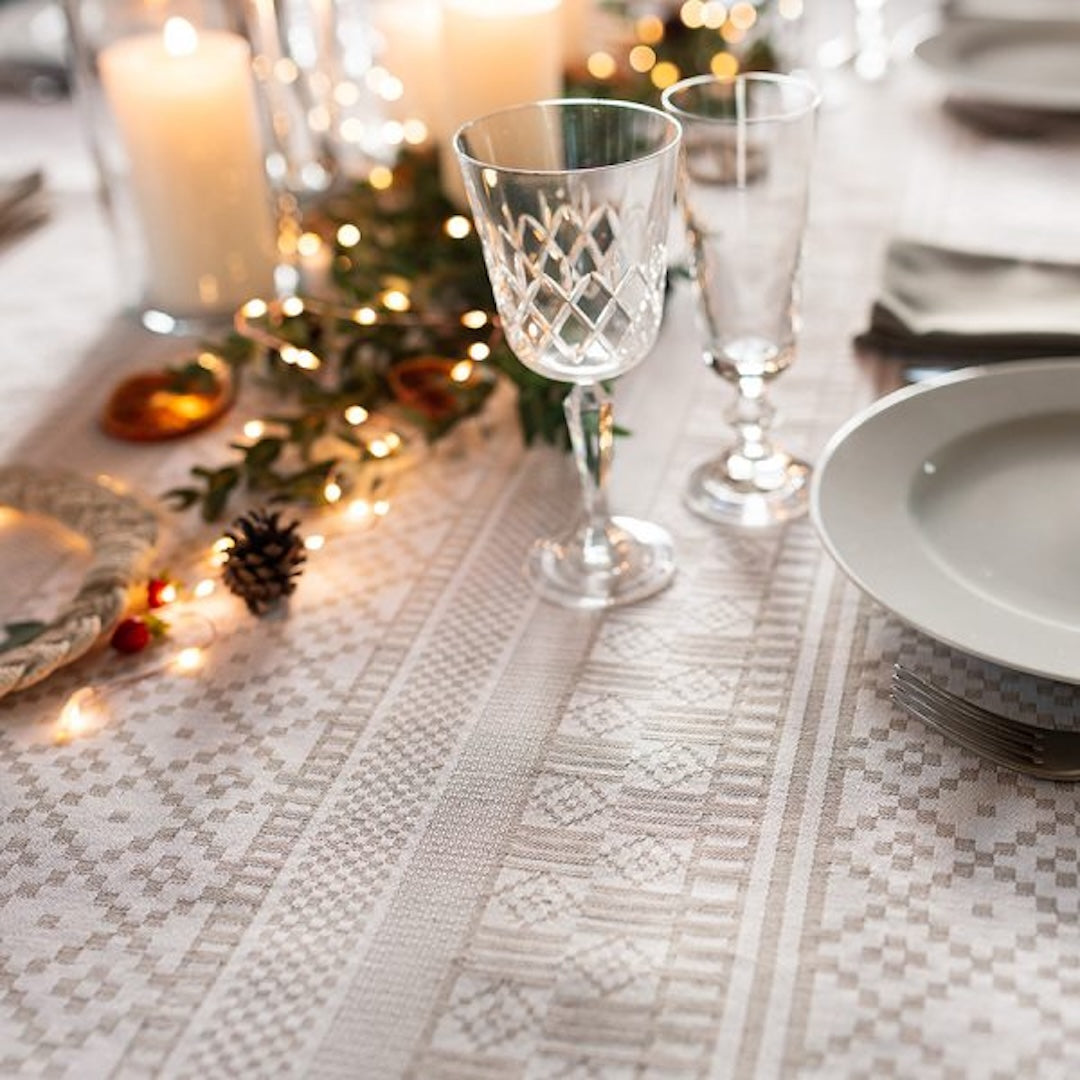 Made by Moutet Tissage, a historic French weaving house since 1919, this beige graphic-patterned tablecloth brings together heritage, quality, and style. A perfect addition to elevate your dining décor with the timeless elegance of French design.