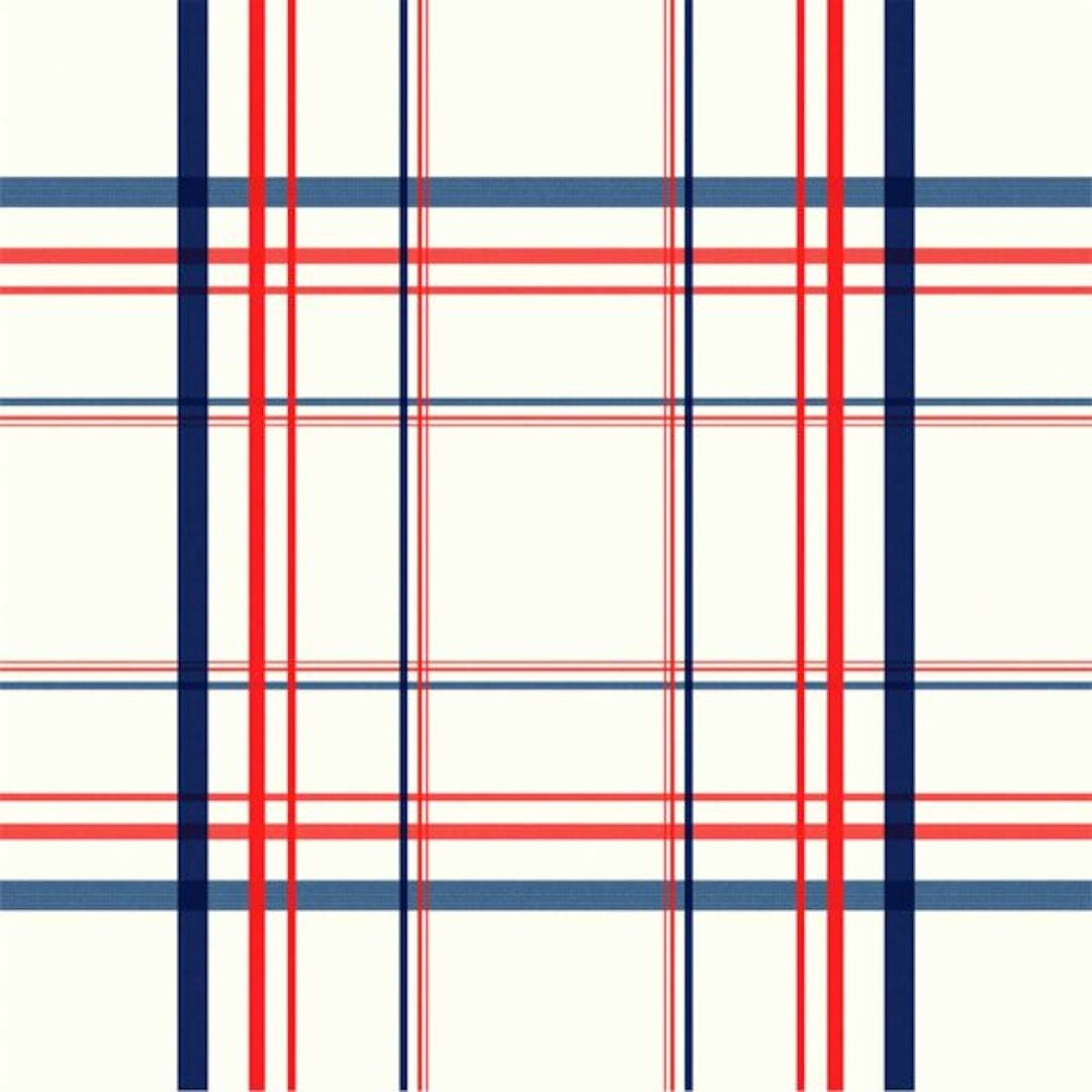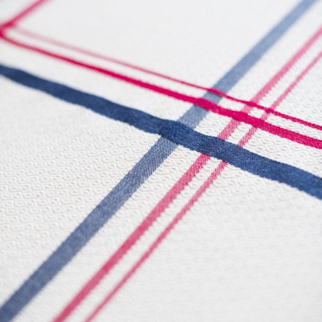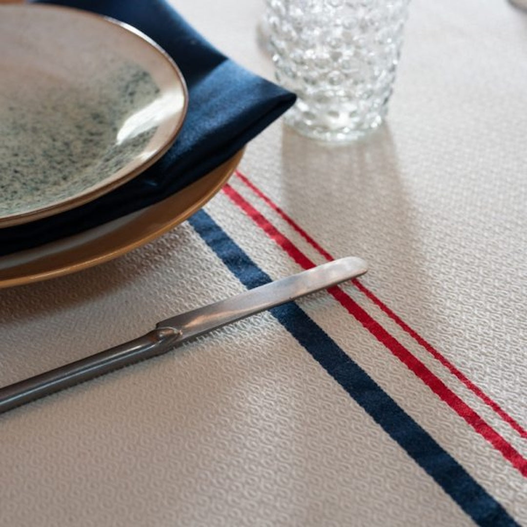 Bring a touch of modern elegance to your dining space with this stunning French-made tablecloth. Featuring bold blue and red stripes on a fresh white background, it is the perfect addition to any table, whether for casual dining or festive occasions.