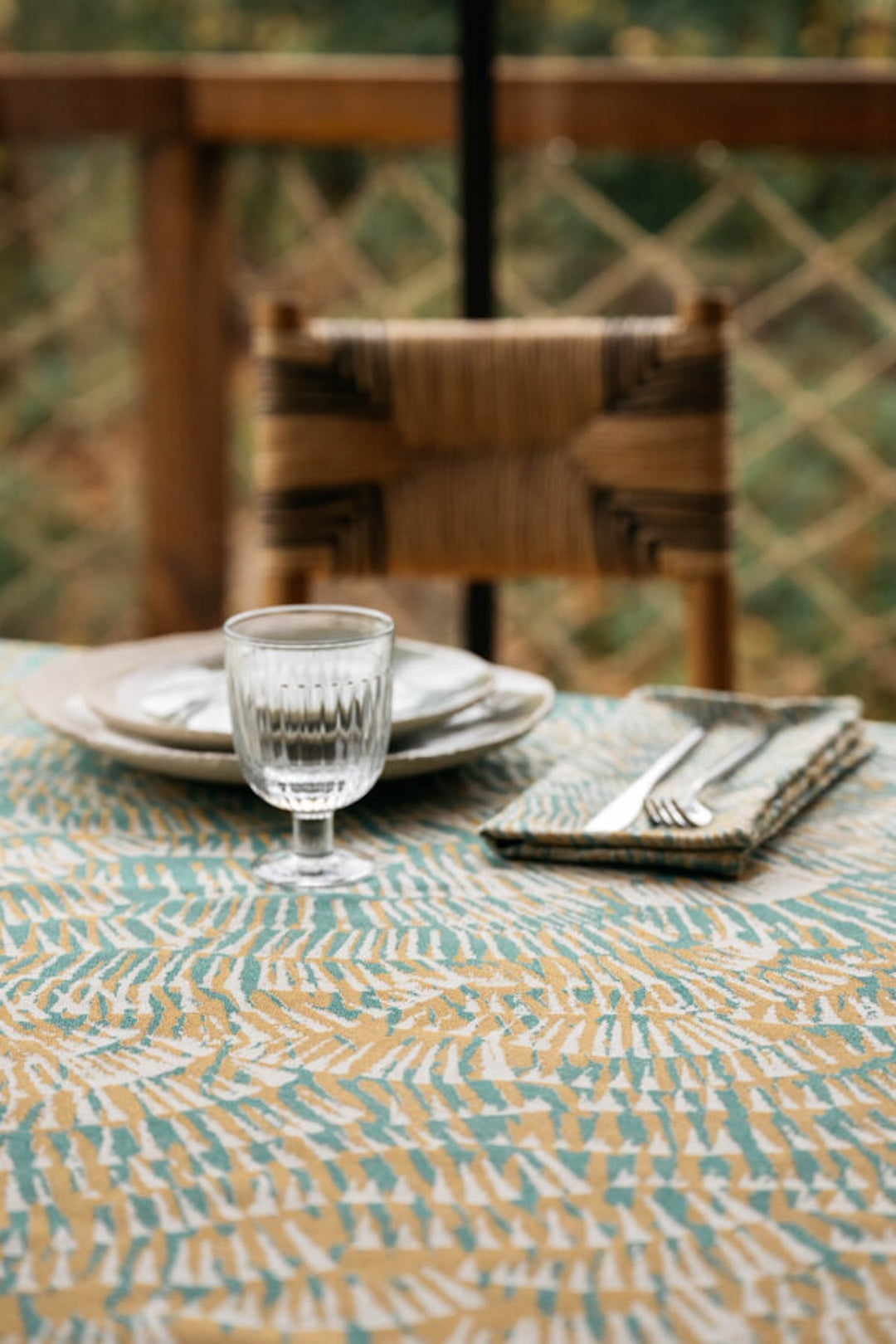 The Fatxada pattern in vert-de-gris embodies the authentic savoir-faire of French weaving, making this tablecloth not only a functional item but also an expression of refined taste and cultural heritage.