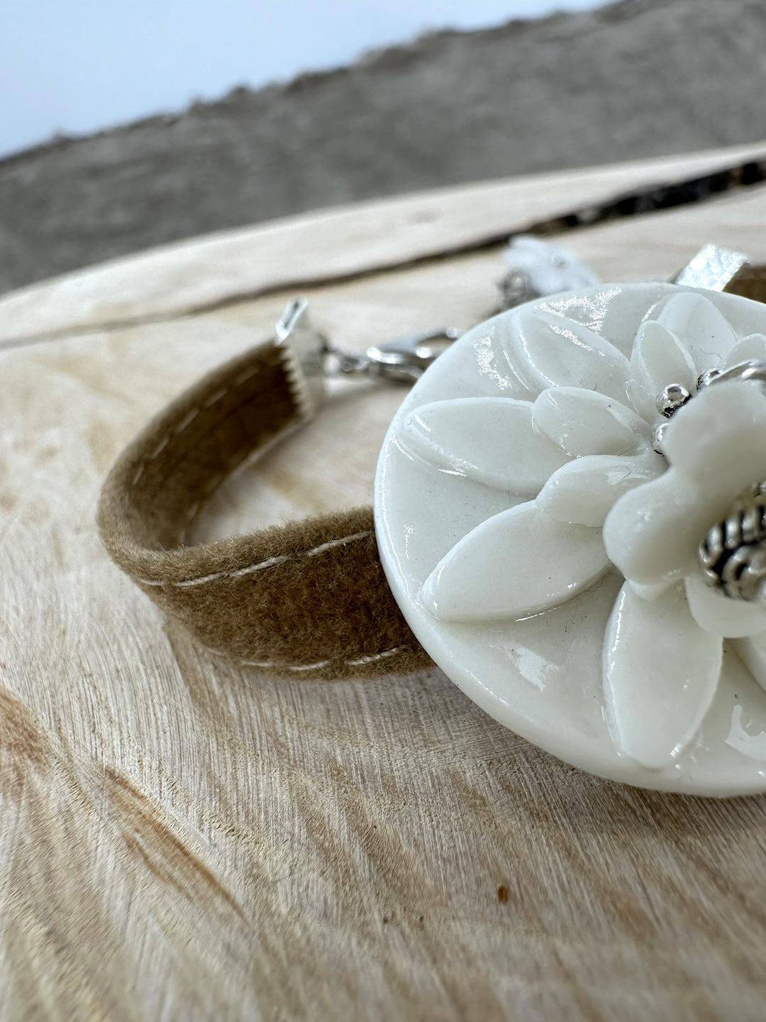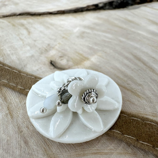 The centerpiece of this creation is a beautifully shaped porcelain medallion, delicately adorned with a sculpted porcelain flower. A cluster of crystal beads and a porcelain floral charm enhance its elegance, while a flat silver-toned bead provides a touch of contemporary refinement. Each detail is meticulously arranged to create a jewel that feels as special as it looks.